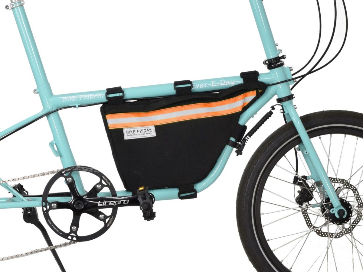This special main frame bag was designed to fit inside the Haul-a-Day Elite and Ever-e-Day Elite bike frames using 6 velcro straps. It has a strong zipper pocket with reflective stripe on one side. The design is water resistant and very durable.